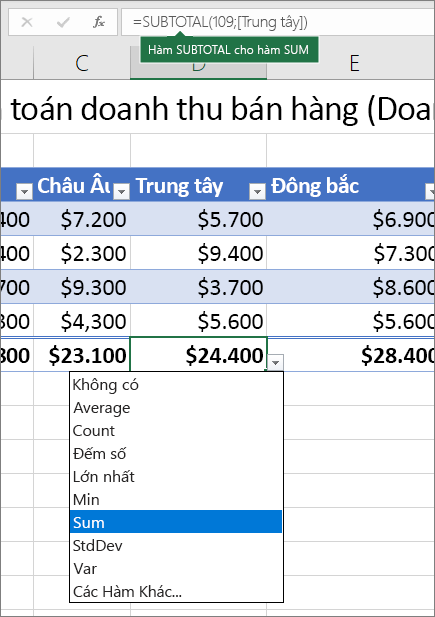 Sử dụng tùy chọn này cho phép bạn dễ dàng hiển thị tổng số cho mỗi cột. Bạn có thể thấy giá trị tổng cũng như nhiều chức năng khác như Trung bình, Min và Max.