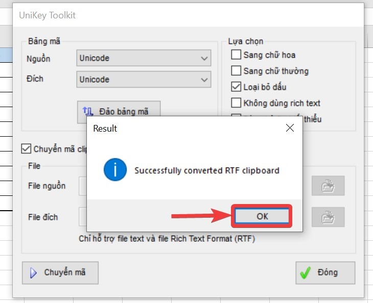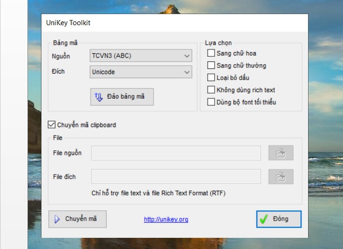Cửa sổ Unikey Toolket xuất hiện, tại đây thực hiện các thao tác: Bảng mã:Nguồn: Chọn bảng mã của font chữ hiện tại (ví dụ: font .VnTime , nguồn: TCVN3 – như hình minh họa) Đích: Chọn bảng mã của font chữ đích (ví dụ: font Times New Roman, đích: Unicode – như hình minh họa) Tích chọn vào chuyển mã clipboard Chọn: Chuyển mã
