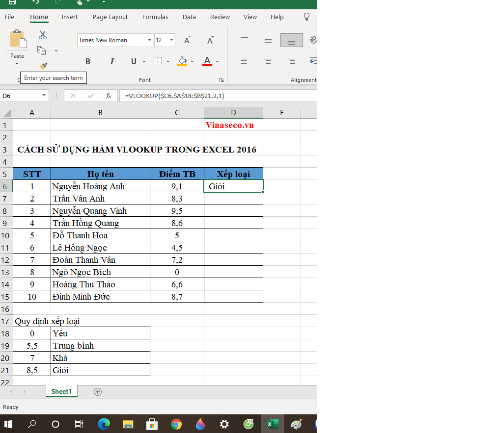 Giờ ta sẽ sử dụng hàm VLOOKUP để nhập xếp loại cho các học sinh. Bạn để ý thấy rằng bảng quy định xếp loại đã được sắp xếp theo thứ tự từ thấp đến cao (từ yếu đến giỏi) nên trong trường hợp này ta có thể dùng dò tìm tương đối.
