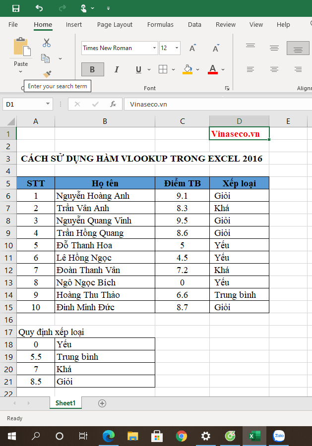 2.2. VD1: Sử dụng hàm VLOOKUP để đánh giá xếp loại của học sinh, nhân viên: