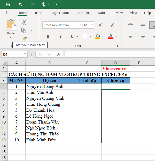 Ở một sheet khác của bảng tính, bạn cần lấy thông tin về trình độ và chức vụ của nhân viên với thứ tự sắp xếp của nhân viên đã thay đổi. Đây mới là lúc bạn thấy được sức mạnh thực sự của hàm VLOOKUP.
