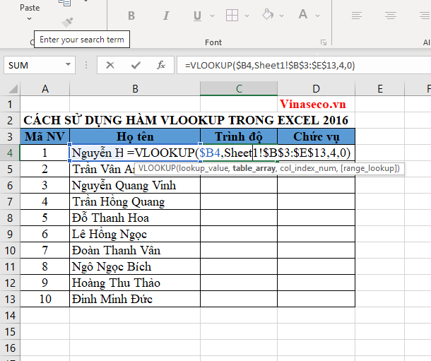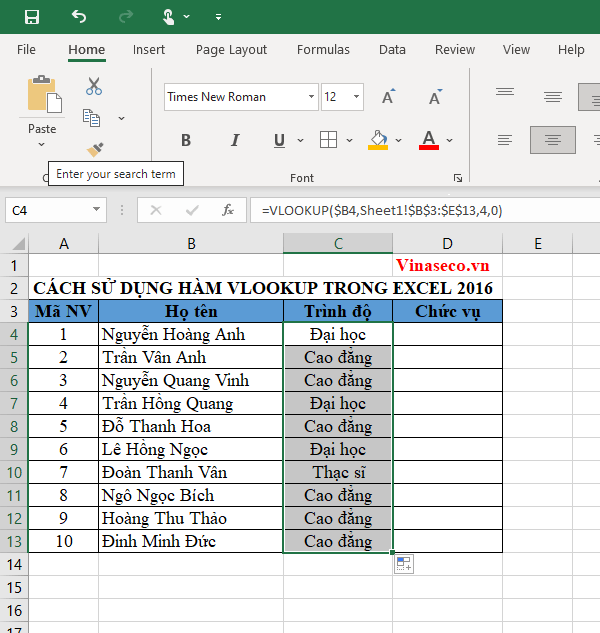 Để điền thông tin trình độ cho các nhân viên, tại ô E4 bạn nhập vào công thức dò tìm tuyệt đối: