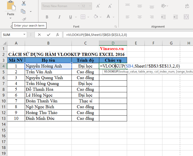 Để dò tìm dữ liệu về "Trình độ" của nhân viên, bạn nhập công thức: =VLOOKUP($B4,Sheet1!$B$3:$E$13,4,0) vào ô C4 của sheet 2.