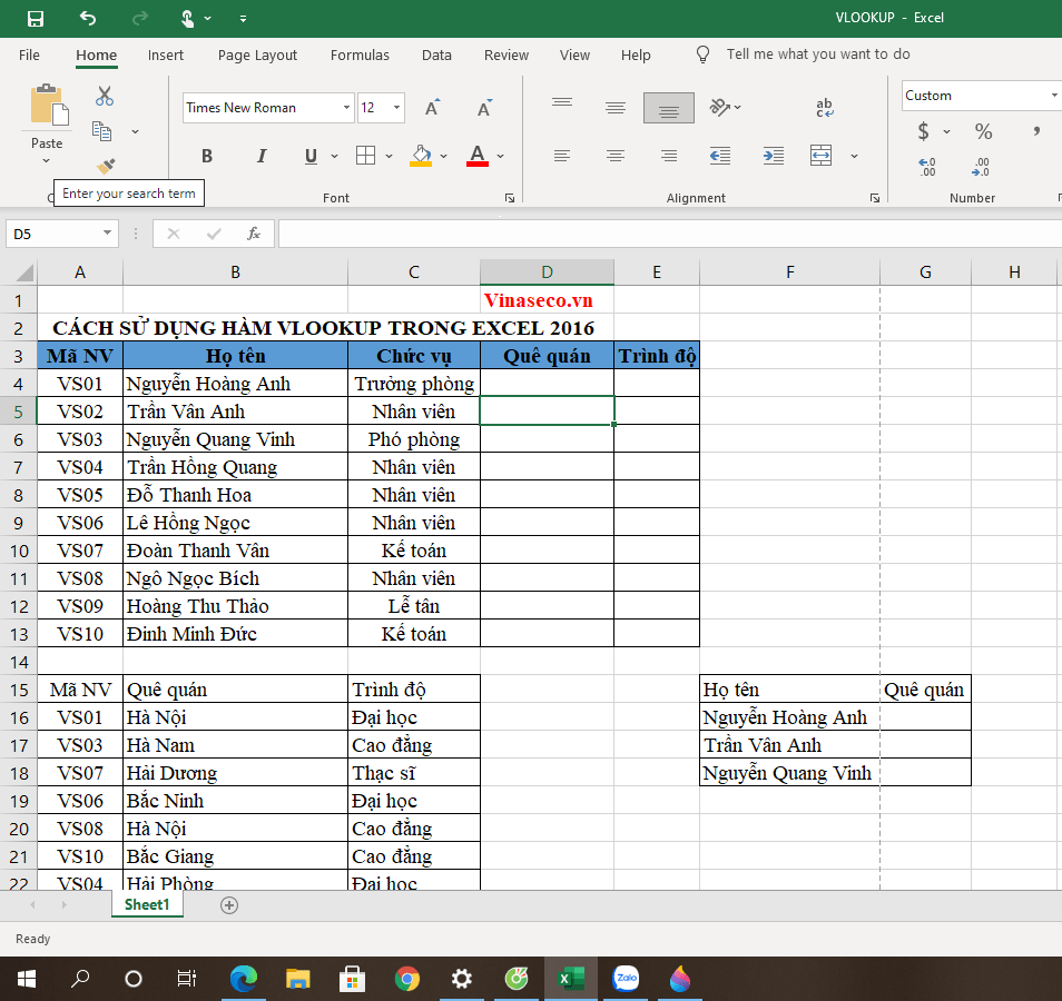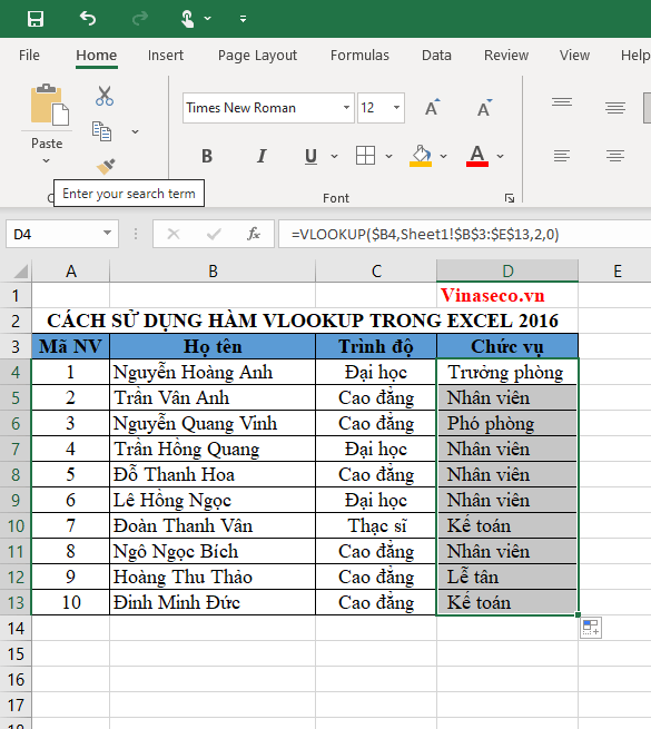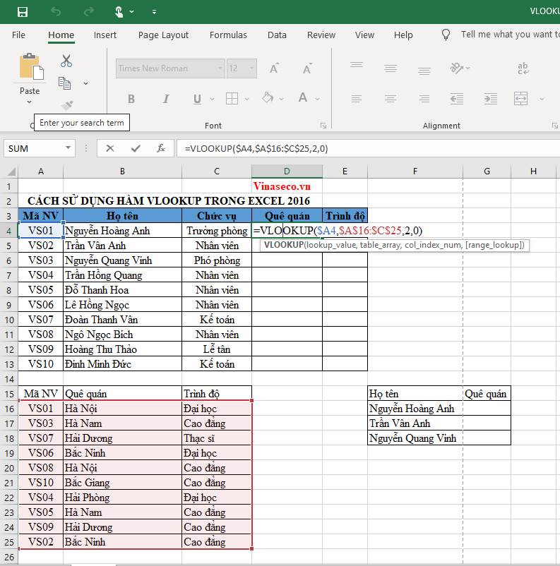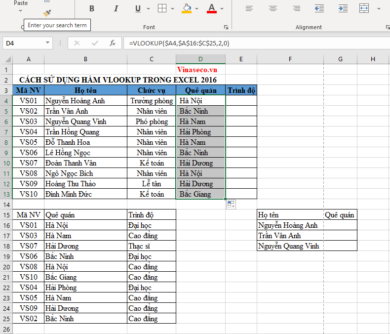 Giờ bạn muốn điền thông tin quê quán cho nhân viên. Tại ô D4, bạn nhập vào công thức dò tìm tuyệt đối như sau: =Vlookup($A4,$A$16:$C$25,2,0)