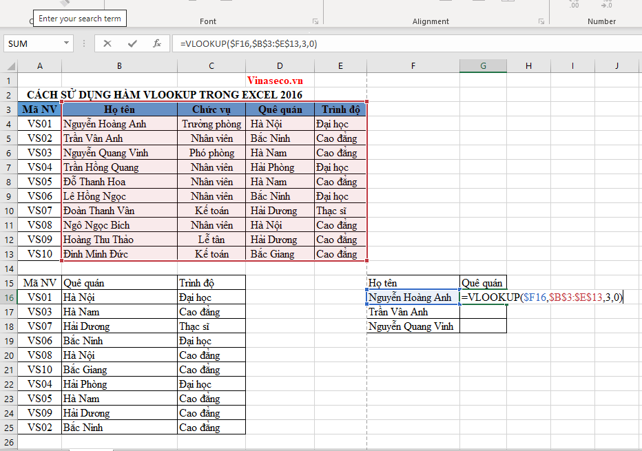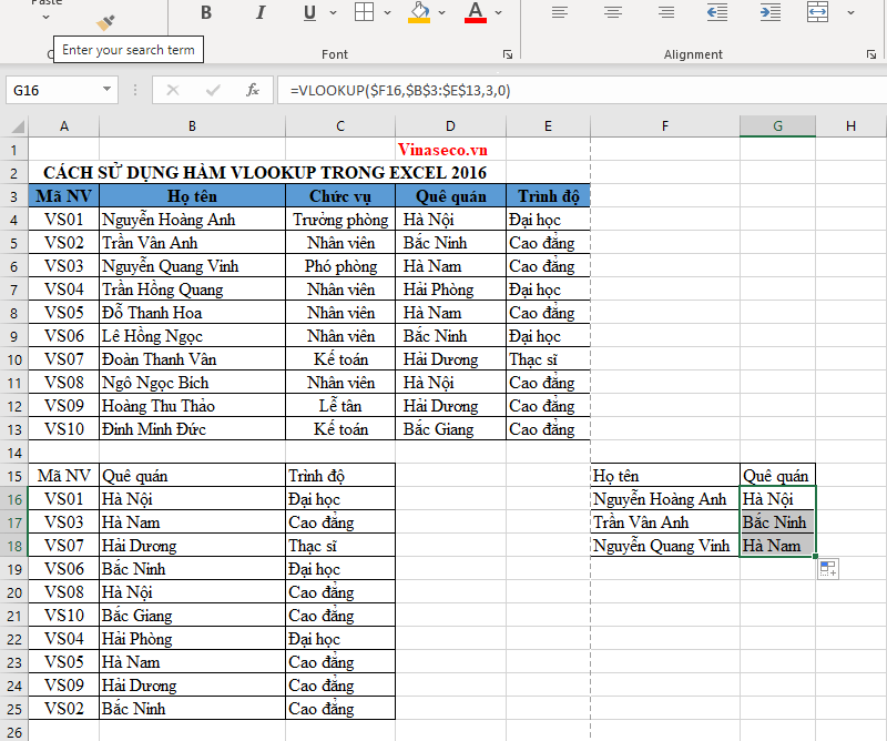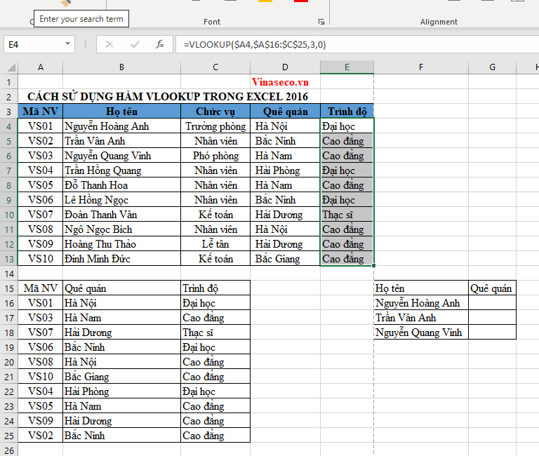Tiếp tục với bộ dữ liệu của ví dụ 2, giờ ta sẽ đi tìm quê quán của 3 nhân viên là Nguyễn Hoàng Anh, Trần Vân Anh và Nguyễn Quang Vinh. Mình đã trích xuất ra thành một bảng mới F15:G18.