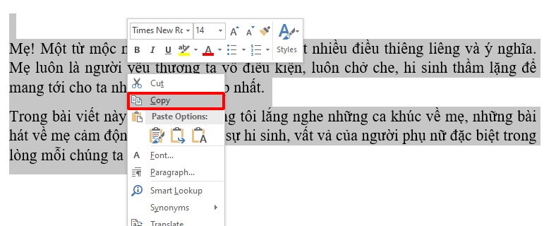 + Bước 5: Tiếp theo bạn kích chuột phải vào vùng văn bản trên Word rồi chọn