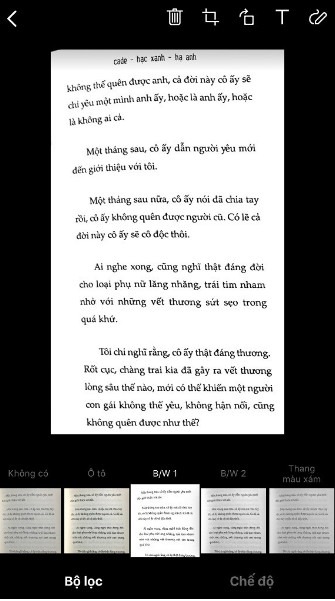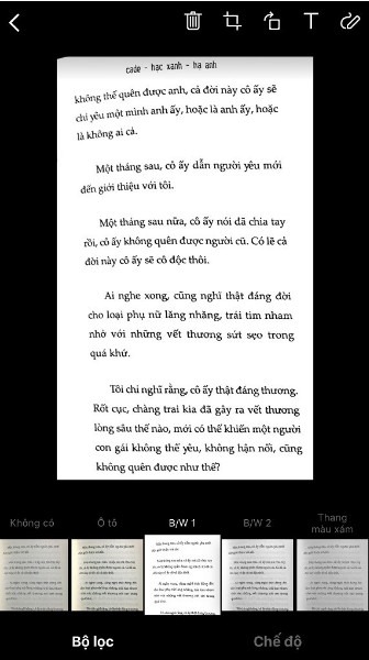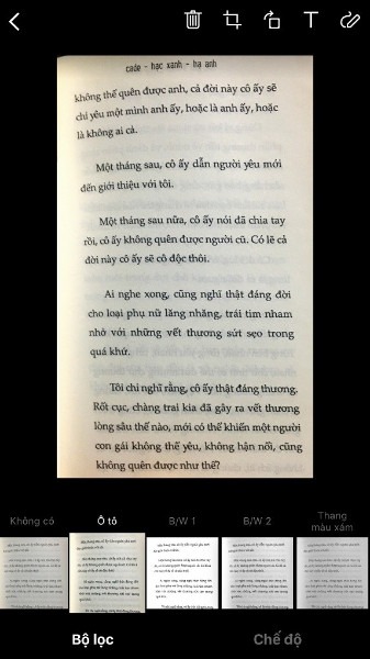 - Ứng dụng cung cấp nhiều bộ lọc, ví dụ như Ô tô, Màu, B/W 1, B/W 2 và bộ lọc thang màu xám giúp nâng cao chất lượng scan tài liệu, ảnh tùy vào nhu cầu người dùng.