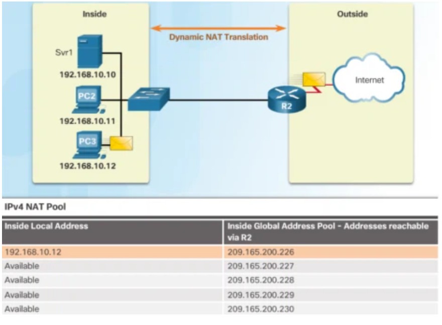 - Dynamic NAT: NAT được thực hiện 1 cách tự động. Trên Router, người quản trị cấu hình 1 danh sách các địa chỉ bên trong cần đi ra ngoài Internet và 1 danh sách các địa chỉ bên ngoài đại diện cho các địa chỉ bên trong. Tiếp theo, người quản trị cấu hình yêu cầu Router NAT danh sách bên trong thành danh sách bên ngoài. Bảng NAT của Router sẽ không có bất kỳ 1 dòng thông tin NAT nào được tạo sẵn mà các dòng thông tin NAT sẽ chỉ được tạo ra khi có gói tin đến Router ra Internet.