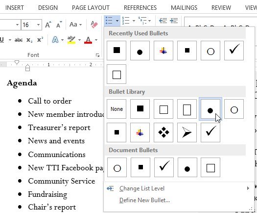 – Di chuyển trỏ chuột qua các kiểu bullet khác nhau và chọn kiểu bullet bạn muốn sử dụng.