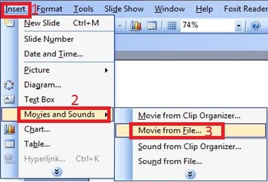 Nếu bạn muốn trình diễn một đoạn video trong bài thuyết trình của mình thì nên làm theo cách sau: Từ menu Insert của Power Point -> Movies and Sounds -> Movie from file. Từ đây bạn có thể chọn file video nào bạn muốn chèn vào Slide.